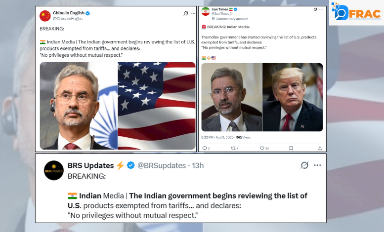 DFRAC के फैक्ट चेक से साफ है कि सोशल मीडिया पर भारत सरकार द्वारा टैरिफ से छूट प्राप्त अमेरिकी उत्पादों की सूची की समीक्षा शुरू करने का दावा फेक है।