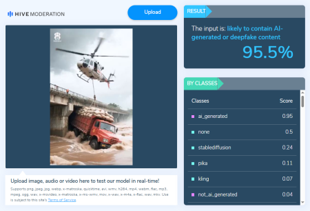 आखिर में हमने वायरल वीडियो को AI डिटेक्शन टूल हाइवमॉडरेशन से जांच की। इस दौरान हमें वीडियो के AI द्वारा जनरेट किए जाने की संभावना 95.5% मिली। साथ ही वीडियो के टॉप लेफ्ट कार्नर में AI जनरेशन टूल का लोगो भी लगा हुवा है जिससे स्पष्ट है कि वीडियो पूर्णतः AI जनरेटेड है।