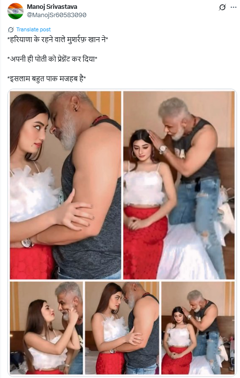 इन तस्वीरों के कोलाज को शेयर करते हुए मनोज श्रीवास्तव नामक यूजर ने लिखा, ‘हरियाणा के रहने वाले मुशर्रफ़ खान ने* *अपनी ही पोती को प्रेग्नेंट कर दिया* *इसलाम बहुत पाक मजहब है’