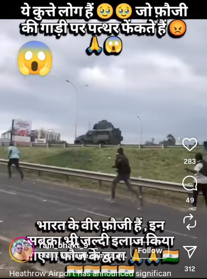 एक वीडियो सोशल मीडिया पर तेजी से वायरल हो रहा है। इस वीडियो में कुछ लोग एक सैन्य वाहन पर पत्थर फेंकते नजर आ रहे हैं। यह वीडियो इंस्टाग्राम पर अंग्रेजी भाषा में कैप्शन के साथ पोस्ट किया गया है, जिसका हिंदी अनुवाद है– “ये लोग * हैं, जो सैनिकों के वाहन पर पत्थर फेंक रहे हैं। ये बहादुर भारतीय सैनिक हैं; सेना इन सभी को जल्द ही संभाल लेगी।”