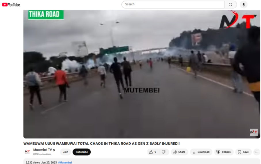 आगे जांच करने पर हमें YouTube पर भी एक ऐसा ही वीडियो मिला। यह वीडियो 25 जून 2025 को ‘MutembeiTV’ नाम के चैनल पर पोस्ट किया गया था। ‘MutembeiTV’ केन्या और अफ्रीकी देशों का एक प्रमुख न्यूज़ चैनल है। वीडियो के कैप्शन में लिखा था – “THEY’RE DEAD! UUUII THEY’RE DEAD! TOTAL CHAOS IN THIKA ROAD AS GEN Z BADLY INJURED!!” (वे मर गए! पूरी तरह से अफरा-तफरी मच गई, थिका रोड पर, Gen Z को बुरी तरह चोट लगी है!!)