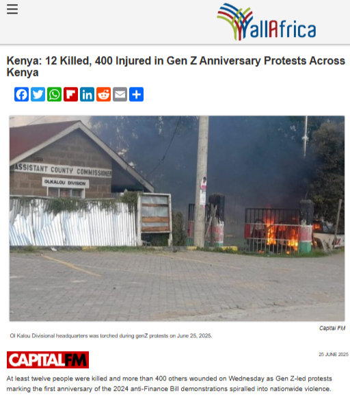 वीडियो के कैप्शन में दिए गए कुछ शब्दों को जब हमने गूगल पर खोजा, तो हमें ‘Allafrica’ वेबसाइट का एक लेख मिला, जो 25 जून 2025 को प्रकाशित हुआ था। उस लेख का शीर्षक था – “केन्या: Gen Z की सालगिरह पर हुए विरोध प्रदर्शन में 12 की मौत, 400 घायल।” इस लेख में बताया गया है कि बुधवार 25 जून 2025 को ‘एंटी-फाइनेंस बिल’ विरोध की पहली सालगिरह पर निकाले गए Gen Z के प्रदर्शनों के दौरान हिंसा फैल गई, जिसमें कम से कम 12 लोगों की मौत हो गई और 400 से ज्यादा घायल हुए।