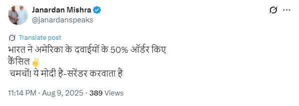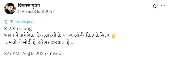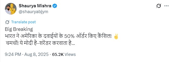 सोशल साईट X पर वेरिफाइड यूजर शौर्य मिश्रा ने लिखा कि Big Breaking भारत ने अमेरिका के दवाईयों के 50% ऑर्डर किए कैंसिल! ✌️ चमचों! ये मोदी है-सरेंडर करवाता है…