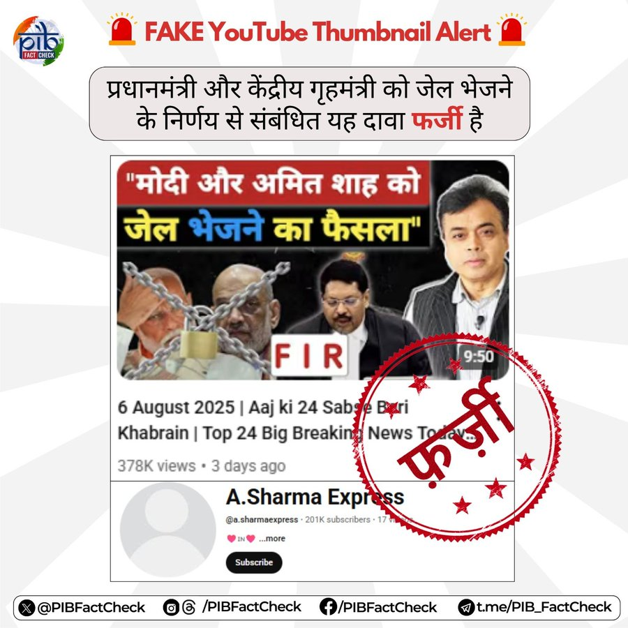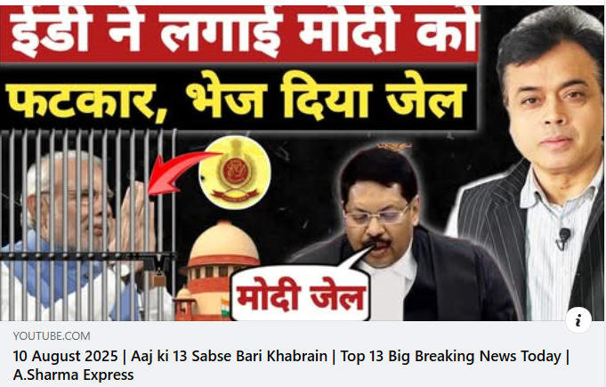यूट्यूब पर A.Sharma Express नामक यूट्यूब चैनल पर अपलोड एक वीडियो के थम्बनेल में CJI बीआर गवई और पीएम मोदी की तस्वीर के साथ एक खबर दी गई है कि पीएम मोदी को जेल भेज दिया गया है। थम्बनेल पर टेक्स्ट लिखा है, ‘ईडी ने लगाई मोदी को फटकार, भेज दिया जेल’। इस खबर में एंकर के तौर पर वरिष्ठ पत्रकार अभिसार शर्मा दिखाई देते हैं और कहते हैं कि यह उनका चैनल है।