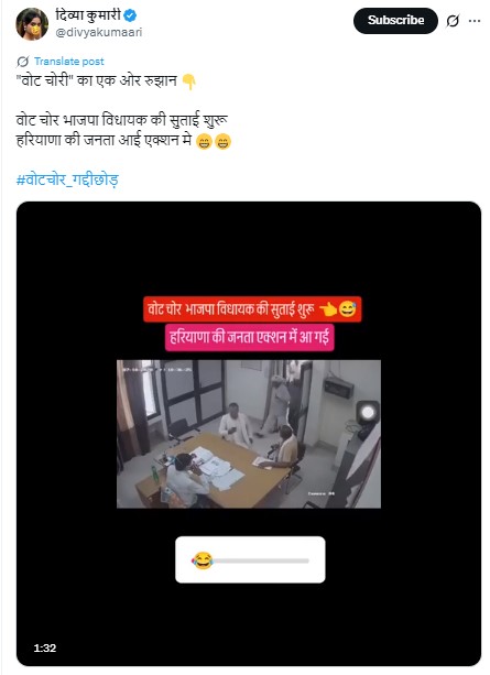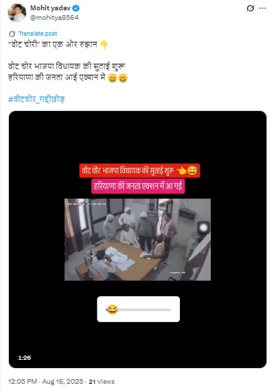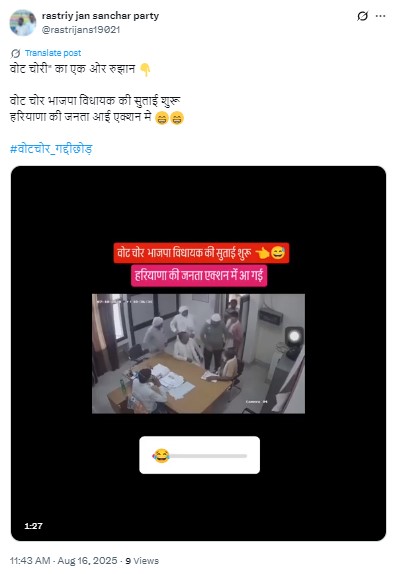 सोशल साईट X पर वेरिफाइड यूजर दिव्या कुमारी ने वायरल वीडियो को शेयर करते हुए लिखा कि “वोट चोरी” का एक ओर रुझान वोट चोर भाजपा विधायक की सुताई शुरू हरियाणा की जनता आई एक्शन मे #वोटचोर_गद्दीछोड़