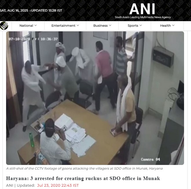 वायरल वीडियो के साथ किये गए दावे की जांच के लिए DFRAC ने सबसे पहले वायरल वीडियो को कीफ्रेम्स में कन्वर्ट किया और फिर अलग-अलग रिवर्स सर्च किया। इस दौरान हमें वायरल वीडियो का एक स्कीनग्रैब न्यूज़ एजेंसी ANI की एक रिपोर्ट में मिला। 23 जुलाई 2020 को पब्लिश इस रिपोर्ट में वायरल वीडियो के बारे में बताया गया कि “करनाल जिले के गगसीना गाँव में बिजली की लाइन बिछाई जा रही थी। कुछ ग्रामीण मुनक विद्युत विभाग के उप-विभागीय अधिकारी (एसडीओ) के पास यह शिकायत लेकर गए कि जो लाइन बिछाई जा रही थी वह उनके खेत के नीचे से गुज़र रही थी। एसडीओ ने मामले को संज्ञान में लिया और ठेकेदार को सूचित किया कि योजना गलत है और उसे बदलने के लिए कहा। जब ग्रामीण एसडीओ के कार्यालय में उनसे इस मामले पर चर्चा कर रहे थे, तभी पाँच लोग वहाँ घुस आए और ग्रामीणों की पिटाई शुरू कर दी। उन्होंने उन पर कुर्सियाँ भी फेंकी। बिजली विभाग ने पुलिस को बुलाया, लेकिन जब तक पुलिस पहुँची, आरोपी भाग चुके थे। बाद में, पुलिस ने एसडीओ के कार्यालय में लगे सीसीटीवी फुटेज के आधार पर पाँच लोगों की पहचान की और पीड़ितों की ओर से घरौंदा थाने में मामला दर्ज किया। पुलिस ने यह भी कहा कि घटना का कारण दोनों पक्षों के बीच आपसी मनमुटाव था।