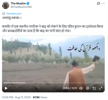 वहीँ एक X यूज़र “TheMuslim786” ने वीडियो शेयर करते हुए लिखा “अल्लाहु अकबर । कश्मीर में एक स्थानीय नागरिक ने बाढ़ को रोकने के लिए पवित्र कुरान का इस्तेमाल किया और प्रत्यक्षदर्शियों का दावा है कि बाढ़ का पानी शांत हो गया।”