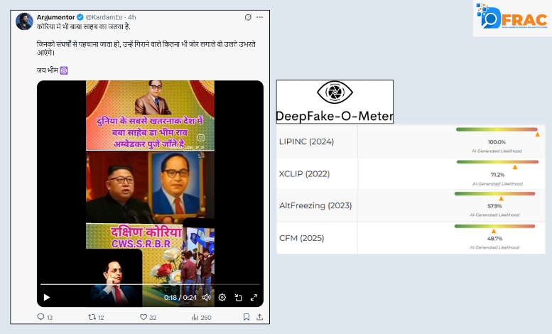 DFRAC की टीम ने वायरल दावे की जांच के लिए सबसे पहले वीडियो को गौर से देखा। हमने पाया कि वीडियो पर टेक्स्ट में दक्षिण कोरिया लिखा गया है, जबकि दावा किया गया है कि उत्तरी कोरिया में बाबा साहब को श्रद्धांजलि दी गई है। इसके बाद हमारी टीम ने AI-जनरेटेड वीडियो की जांच करने वाले टूल Deepfake-O-Meter पर इसकी जांच की। हमारे जांच में रिजल्ट सामने आया कि इस वीडियो के AI-जनरेटेड होने के चांज ज्यादा हैं।