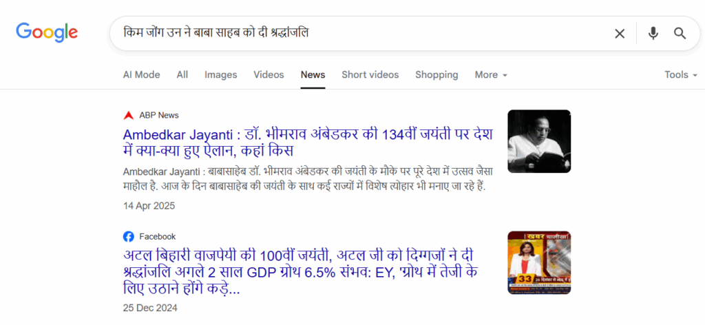 वहीं हमारी टीम ने उत्तरी कोरिया में किम जोंग उन द्वारा बाबा साहब अंबेडकर को श्रद्धांजलि देने के संदर्भ में गूगल पर हिन्दी और अंग्रेजी भाषा में कुछ कीवर्ड्स सर्च किया। लेकिन हमें किसी भी मुख्यधारा की मीडिया द्वारा प्रकाशित कोई खबर नहीं मिली।