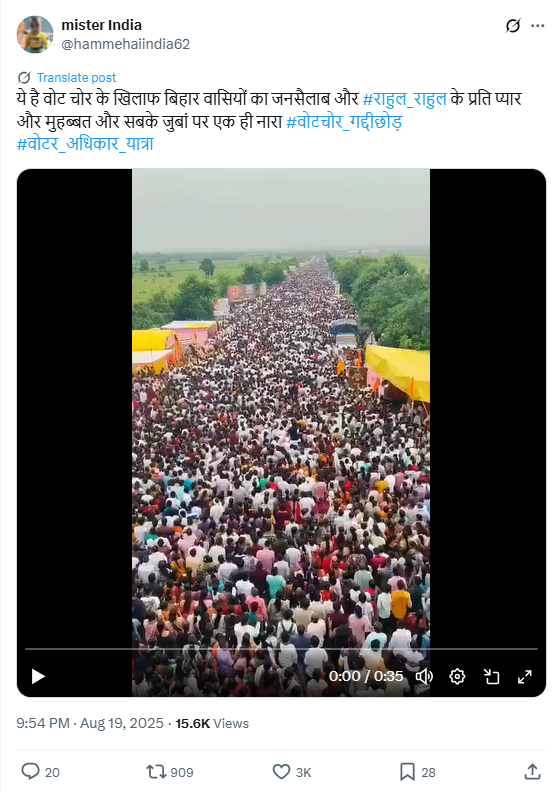मिस्टर इंडिया नामक यूजर ने इस वीडियो को शेयर कर लिखा, ‘ये है वोट चोर के खिलाफ बिहार वासियों का जनसैलाब और #राहुल_राहुल के प्रति प्यार और मुहब्बत और सबके जुबां पर एक ही नारा #वोटचोर_गद्दीछोड़ #वोटर_अधिकार_यात्रा‘