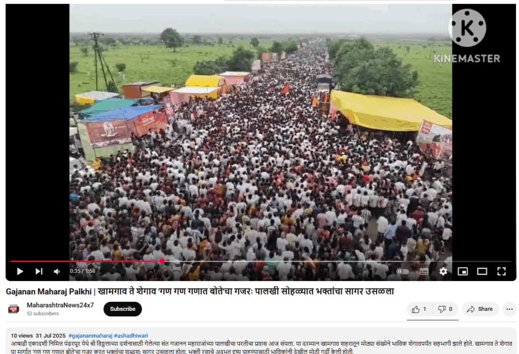 DFRAC की टीम ने जांच में पाया कि यह वीडियो बिहार में राहुल गांधी की यात्रा का नहीं है। यह वीडियो महाराष्ट्र के शेगांव में संत गजानन महाराज की पालकी यात्रा का है, जिसमें हजारों की संख्या में श्रद्धालु शामिल हुए थे। इस वीडियो को 31 जुलाई को MaharashtraNews24x7 नामक यूट्यूब चैनल पर अपलोड किया गया है, जिसके साथ जानकारी दी गई है कि आषाढ़ी एकादशी के अवसर पर श्री विट्ठल के दर्शन हेतु पंढरपुर गए संत गजानन महाराज की पालकी की वापसी यात्रा संपन्न हुई। इस दौरान, खामगांव शहर से बड़ी संख्या में भक्तगण शेगांव तक की शोभायात्रा में शामिल हुए।