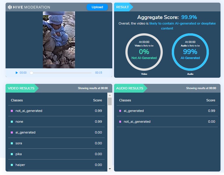 ऐसे में जांच को आगे बढ़ाते हुए हमने वायरल वीडियो की AI डिटेक्टर टूल हाइव मॉडरेशन पर जांच की। हमारी जांच में सामने आया कि वायरल वीडियो के AI-जनरेटेड होने के 99 प्रतिशत चांस हैं।