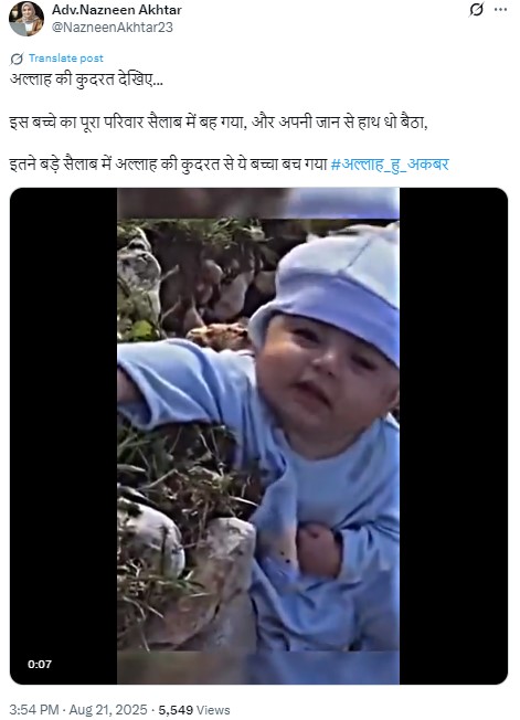 सोशल साईट X पर यूजर एडवोकेट नाजनीन अख्तर ने वायरल वीडियो को शेयर करते हुए लिखा कि अल्लाह की कुदरत देखिए… इस बच्चे का पूरा परिवार सैलाब में बह गया, और अपनी जान से हाथ धो बैठा, इतने बड़े सैलाब में अल्लाह की कुदरत से ये बच्चा बच गया #अल्लाह_हु_अकबर