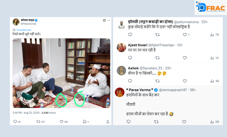 DFRAC के फैक्ट चेक से साफ है कि मुंगेर की रहमानी खानकाह में राहुल गांधी और तेजस्वी यादव को चाय परोसी गई थी, जिसे बीयर परोसे जाने का बताकर गलत दावा किया गया है।