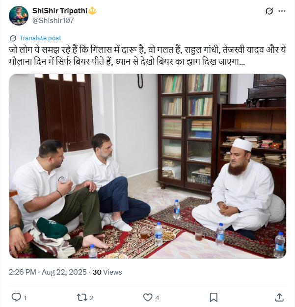 राहुल गांधी की खानकाह रहमानी दौरे की एक तस्वीर सोशल मीडिया पर शेयर की जा रही है। इस तस्वीर के साथ दावा किया जा रहा है कि यहां राहुल गांधी को बीयर परोसी गई। इस तस्वीर को शेयर करते हुए शिशिर त्रिपाठी नामक यूजर ने लिखा, ‘जो लोग ये समझ रहे हैं कि गिलास में दारू है, वो गलत हैं, राहुल गांधी, तेजस्वी यादव और ये मौलाना दिन में सिर्फ बियर पीते हैं, ध्यान से देखो बियर का झाग दिख जाएगा…’