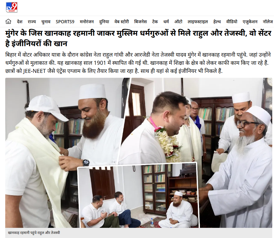 बिहार में कांग्रेस नेता राहुल गांधी की ‘वोट अधिकार यात्रा’ चल रही है। राहुल गांधी के साथ तेजस्वी यादव और इंडिया गठबंधन के अन्य नेता भी इस यात्रा में शामिल है। यात्रा के मुंगेर पहुंचने पर राहुल गांधी प्रसिद्ध रहमानी खानकाह भी गए, जहां उन्होंने मुस्लिम धर्मगुरुओं से मुलाकात की। रहमानी खानकाह वर्ष 1901 में स्थापित हुई थी और यह शिक्षा के क्षेत्र में खासतौर पर इंजीनियरिंग सेक्टर में बेहतर काम कर रही है।