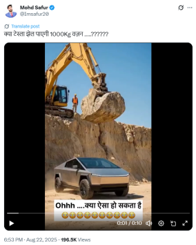 वहीं X पर वेरिफाइड यूज़र @Imsafur20 ने इस वीडियो को शेयर करते हुए लिखा: “क्या टेस्ला झेल पाएगी 1000Kg वजन …..??????”