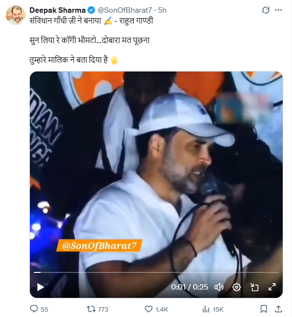 सोशल मीडिया पर कांग्रेस नेता राहुल गांधी का एक बयान वायरल हो रहा है। इस बयान में राहुल गांधी को यह कहते हुए सुना जा सकता है, ‘संविधान किसने बनाया? नहीं, संविधान किसने बताया। गांधी जी ने जिंदगी दी, संविधान बनाया।’ इस वीडियो को शेयर करते हुए दीपक शर्मा नामक यूजर ने लिखा, ‘संविधान गाँधी ज़ी ने बनाया – राहुल गाण्डी, सुन लिया रे कॉंगी भीमटो… दोबारा मत पूछना तुम्हारे मालिक ने बता दिया है’