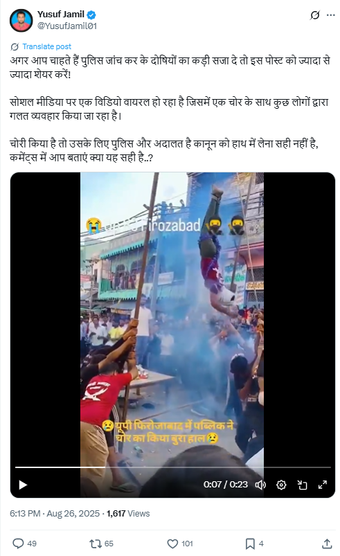 इस वीडियो को शेयर करते हुए युसुफ जमाल नामक यूजर ने लिखा, ‘अगर आप चाहते हैं पुलिस जांच कर के दोषियों का कड़ी सजा दे तो इस पोस्ट को ज्यादा से ज्यादा शेयर करें! सोशल मीडिया पर एक विडियो वायरल हो रहा है जिसमें एक चोर के साथ कुछ लोगों द्वारा गलत व्यवहार किया जा रहा है। चोरी किया है तो उसके लिए पुलिस और अदालत है कानून को हाथ में लेना सही नहीं है, कमेंट्स में आप बताएं क्या यह सही है..?’