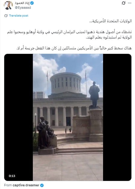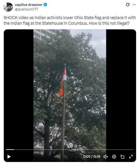 सोशल साईट X पर वेरिफाइड यूजर इयाद अल-हमूद ने वायरल वीडियो को शेयर करते हुए अरबी में लिखा कि الولايات المتحدة الأمريكية… نشطاء من أصول هندية ذهبوا لمبنى البرلمان الرئيسي في ولاية أوهايو وسحبوا علم الولاية ثم استبدلوه بعلم الهند. هناك سخط كبير حالياً بين الأمريكيين متسائلين إن كان هذا الفعل جريمة أم لا. (अनुवाद – संयुक्त राज्य अमेरिका… भारतीय मूल के कार्यकर्ता ओहियो स्टेट कैपिटल बिल्डिंग पहुँचे, राज्य का झंडा उतार दिया और उसकी जगह भारतीय झंडा लगा दिया। अमेरिकियों में व्यापक आक्रोश है और वे सवाल उठा रहे हैं कि क्या यह कृत्य अपराध है।)