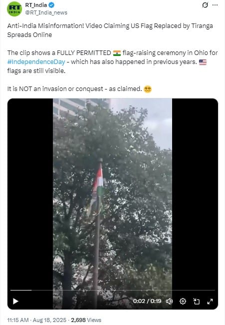 इस क्लिप में #स्वतंत्रतादिवस के अवसर पर ओहियो में पूरी तरह से अनुमति भारतीय ध्वजारोहण समारोह दिखाया गया है – जो पिछले वर्षों में भी हुआ है। यहां अमेरिकी झंडा अभी भी दिखाई दे रहा है। यह कोई आक्रमण या विजय नहीं है – जैसा कि दावा किया जा रहा है।