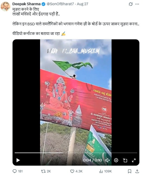 सोशल मीडिया पर एक वीडियो जमकर वायरल हो रहा है। इस वीडियो में देखा जा सकता है कि गणेश जी के पोस्टर पर चढ़कर एक युवक हरा झंडा लहरा रहा है। सोशल मीडिया यूजर्स इस वीडियो को कर्नाटक का बताकर शेयर कर रहे हैं।