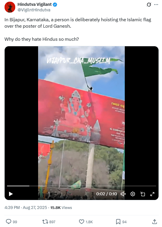 Hindutva Vigilant नामक यूजर ने वीडियो शेयर कर लिखा, ‘कर्नाटक के बीजापुर में एक व्यक्ति जानबूझकर भगवान गणेश के पोस्टर पर इस्लामी झंडा फहरा रहा है। ये लोग हिंदुओं से इतनी नफ़रत क्यों करते हैं?’ (हिन्दी अनुवाद)