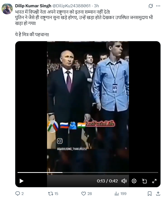 इस वीडियो को शेयर करते हुए दिलीप कुमार सिंह नामक यूजर ने लिखा, ‘भारत में विपक्षी नेता अपने राष्ट्रगान को इतना सम्मान नहीं देते! पुतिन ने जैसे ही राष्ट्रगान सुना खड़े होगए, उन्हें खड़ा होते देखकर उपस्थित जनसमुदाय भी खड़ा हो गया! ये है मित्र की पहचान!!’