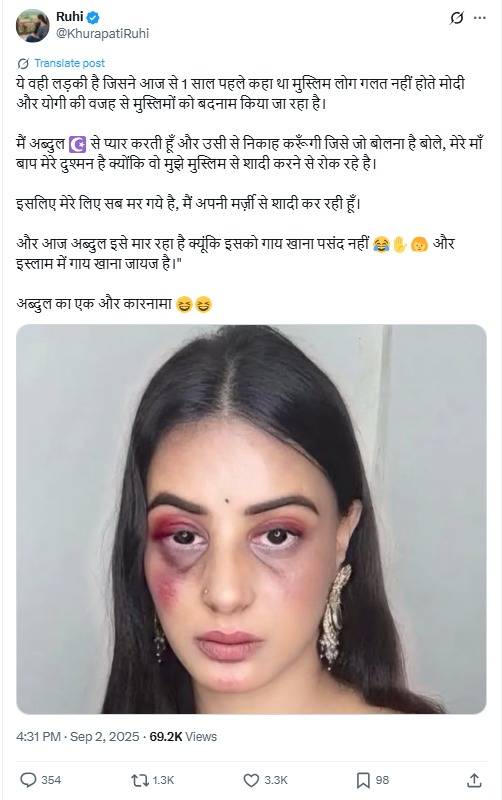 एक एक्स यूजर @KhurapatiRuhi ने यह तस्वीर शेयर करते हुए लिखा: “ये वही लड़की है जिसने आज से 1 साल पहले कहा था मुस्लिम लोग गलत नहीं होते मोदी और योगी की वजह से मुस्लिमों को बदनाम किया जा रहा है। मैं अब्दुल से प्यार करती हूँ और उसी से निकाह करूँगी जिसे जो बोलना है बोले, मेरे माँ बाप मेरे दुश्मन है क्योंकि वो मुझे मुस्लिम से शादी करने से रोक रहे है। इसलिए मेरे लिए सब मर गये है, मैं अपनी मर्ज़ी से शादी कर रही हूँ। और आज अब्दुल इसे मार रहा है क्यूंकि इसको गाय खाना पसंद नहीं और इस्लाम में गाय खाना जायज है।” अब्दुल का एक और कारनामा “