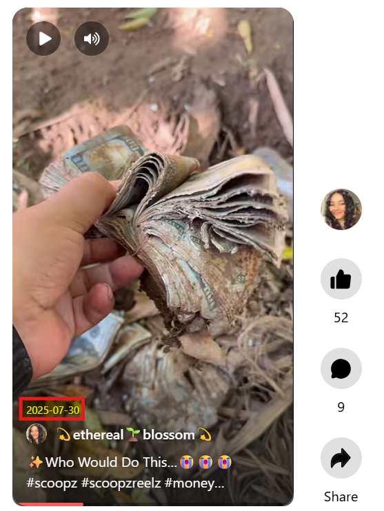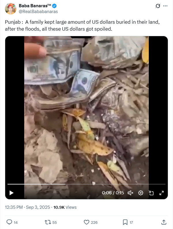 बाबा बनारसी नामक यूजर ने वीडियो शेयर करते हुए अंग्रेजी भाषा में कैप्शन लिखा, जिसका हिन्दी अनुवाद है, ‘पंजाब: एक परिवार ने अपनी जमीन में बड़ी मात्रा में अमेरिकी डॉलर दबा कर रखे थे, बाढ़ के बाद ये सभी अमेरिकी डॉलर खराब हो गए।’