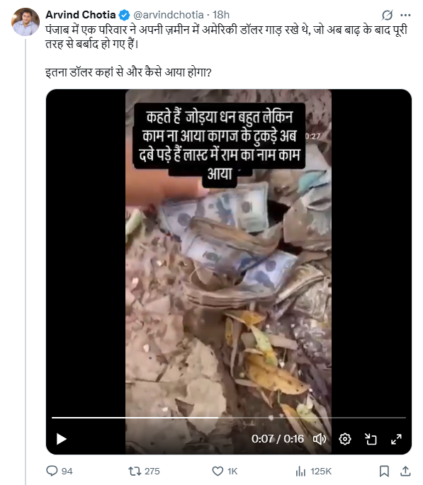 अरविंद चोटिया नामक यूजर ने इस वीडियो को शेयर कर सवाल उठाया है कि इतना डॉलर कहां से आया? उन्होंने लिखा, ‘पंजाब में एक परिवार ने अपनी ज़मीन में अमेरिकी डॉलर गाड़ रखे थे, जो अब बाढ़ के बाद पूरी तरह से बर्बाद हो गए हैं। इतना डॉलर कहां से और कैसे आया होगा?’