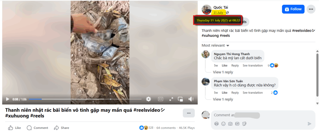इसके अलावा फेसबुक पर खुद को वियतनाम के होने का दावा करने वाले शख्स ने भी इस वीडियो को 31 जुलाई 2025 को पोस्ट करते हुए यह दावा किया है कि ‘समुद्र तट पर कचरा बीन रहे युवक की किस्मत चमकी‘।