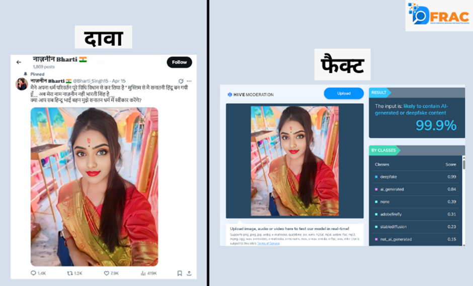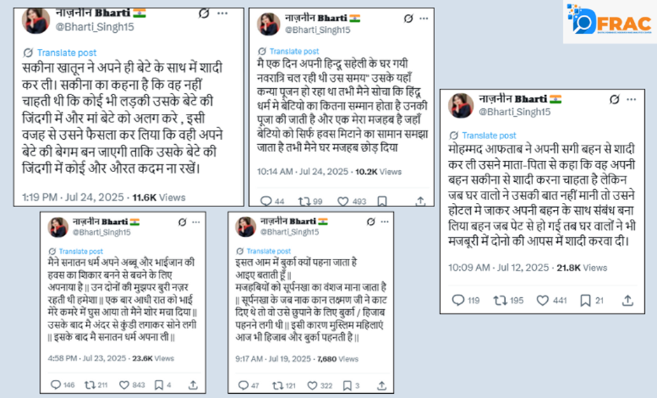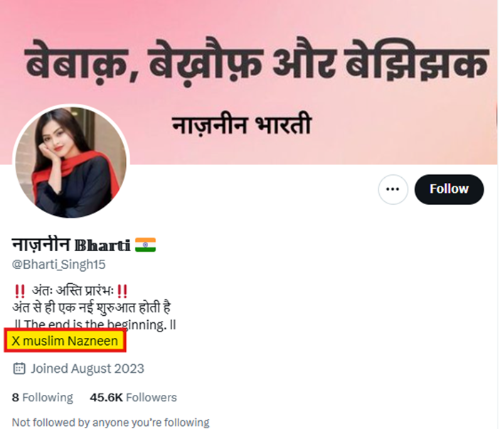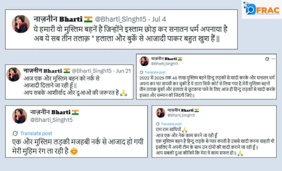 नाजनीन भारती की ऑनलाइन गतिविधियों में एक और खतरनाक पैटर्न यह है कि वह बार-बार मुस्लिम लड़कियों के धर्मांतरण से जुड़ा फेक नैरेटिव गढ़ती है। उसके कई पोस्ट्स में यह दिखाने की कोशिश की गई है कि मुस्लिम महिलाएं अपने धर्म से असंतुष्ट हैं और बड़ी संख्या में “सनातन धर्म” या दूसरे पंथ स्वीकार कर रही हैं।