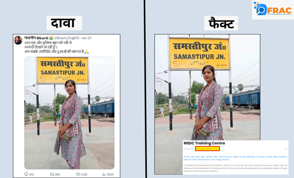 नाजनीन भारती उर्फ भारती सिंह ने 21 जून 2025 को एक तस्वीर के साथ किए गए एक पोस्ट में दावा किया कि वह किसी मुस्लिम लड़की को आजादी दिलाने जा रही है। इस तस्वीर में देखा जा सकता है कि वह बिहार के समस्तीपुर रेलवे स्टेशन पर खड़ी है। हालांकि जब हमारी टीम ने इस तस्वीर की जांच की तो पाया यह तस्वीर लगभग 8 साल पुरानी है और इसे एक ब्लॉग में 21 फरवरी 2017 को पोस्ट किया गया है। इन दोनों तस्वीरों को देखने पर यह पाया गया कि नाजनीन भारती ने इस तस्वीर को एडिट करके पोस्ट किया है।