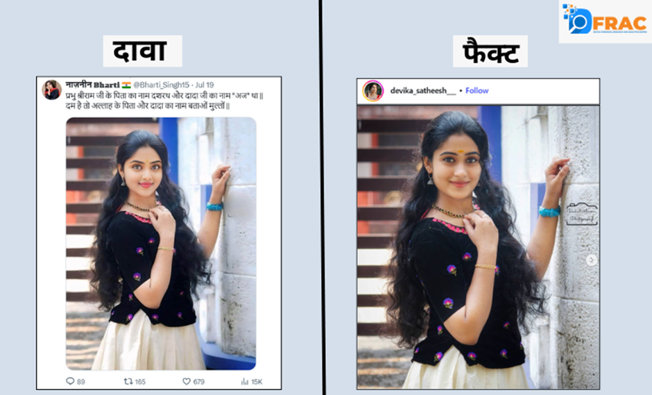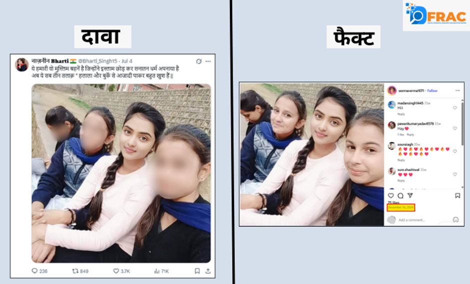 नाजनीन भारती ने 4 जुलाई को तीन लड़कियों के साथ एक फोटो शेयर कर दावा किया कि ये सभी मुस्लिम लड़कियां हैं, जिन्होंने इस्लाम धर्म छोड़कर सनातन धर्म अपना लिया है। हमने जब इस तस्वीर की जांच की, तो पाया कि इस तस्वीर को 16 दिसंबर 2024 को एक यूजर ने इंस्टाग्राम पर पोस्ट किया है। यहां यह स्पष्ट हो रहा है कि नाजनीन भारती के यह तस्वीर पोस्ट करने से पहले से ही यह इंटरनेट पर मौजूद है, जो उसके दावे को भ्रामक साबित करता है।