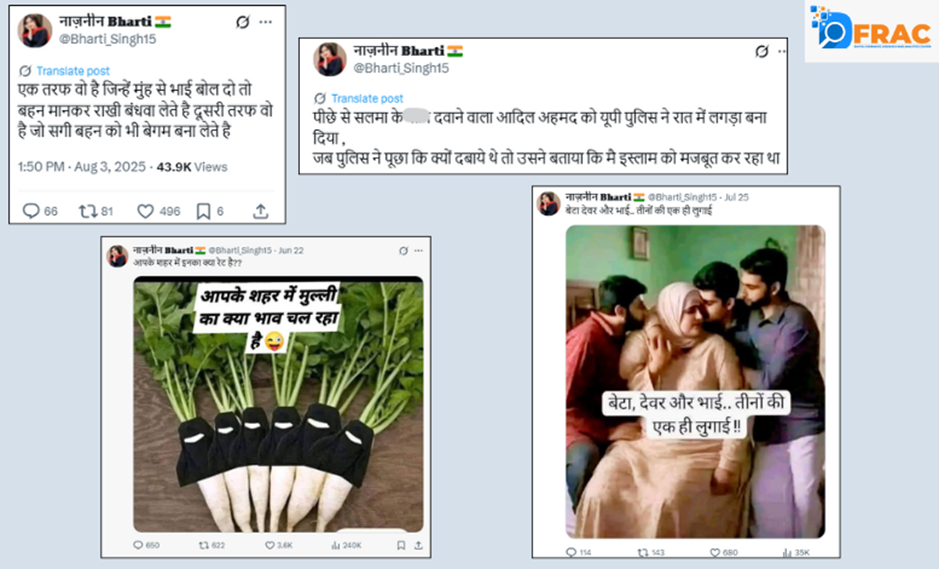 नाजनीन भारती के सोशल मीडिया पोस्ट्स को देखने से साफ पता चलता है कि उसका कंटेंट पैटर्न सुनियोजित है और एक खास नैरेटिव को गढ़ने पर केंद्रित है। उसके पोस्ट्स में लगातार मुस्लिम समुदाय के प्रति नकारात्मक दिखाई देती है। उसके पोस्टों में कभी धार्मिक रीति-रिवाजों का मज़ाक उड़ाकर, तो कभी काल्पनिक घटनाओं के बहाने मुस्लिम समाज को बदनाम करने की कोशिश की जाती है।