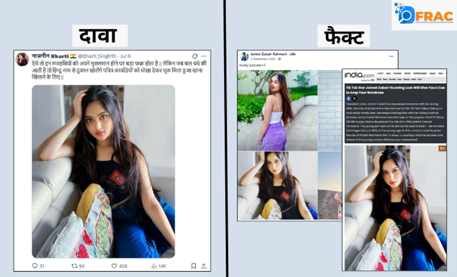 नाजनीन भारती केवल भड़काऊ और अपमानजनक कंटेंट ही नहीं डालती, बल्कि वह सोशल मीडिया पर कई फेक और भ्रामक सूचनाएं भी शेयर करती रही है। उसके द्वारा फैलाई गई सूचनाओं में अधिकतर सामग्री मुस्लिम समुदाय को लेकर नकारात्मक नैरेटिव गढ़ने और धार्मिक ध्रुवीकरण करने वाली होती है। इन पोस्ट्स में बिना किसी तथ्यात्मक आधार के ऐसे दावे किए जाते हैं जो पूरी तरह से गलत होते हैं, लेकिन उन्हें इस तरह प्रस्तुत किया जाता है मानो वे सच्चाई हों। यहां हम कुछ फेक और भ्रामक सूचनाओं का फैक्ट चेक प्रदान कर रहे हैं।