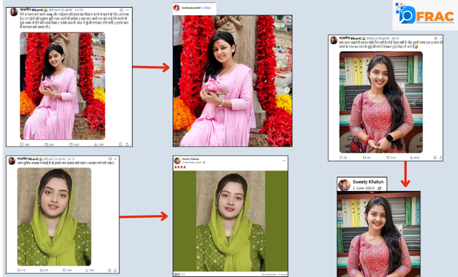 नाजनीन भारती सोशल मीडिया पर मौजूद अन्य लड़कियों की तस्वीरों के साथ छेड़छाड़ कर उन्हें भड़काऊ और नफरती पोस्ट्स में इस्तेमाल करती है। इंटरनेट से ली गई इन तस्वीरों को एडिट कर या उन पर आपत्तिजनक कैप्शन जोड़कर वह उन्हें अपनी फर्जी पहचान और एजेंडे का हिस्सा बना देती है। कई बार तस्वीरों पर ऐसे टेक्स्ट जोड़े जाते हैं, जिनसे यह संदेश जाए कि मुस्लिम महिलाएं अपने धर्म या परिवार के कारण प्रताड़ित हैं, और उन्हें धर्म छोड़ देना चाहिए। नाजनीन भारती का यह पैटर्न यह साबित करता है कि उसकी गतिविधियां केवल फेक पहचान तक सीमित नहीं हैं, बल्कि दूसरों की असली तस्वीरों को हथियार बनाकर भड़काऊ प्रोपेगेंडा चलाने की एक सुनियोजित रणनीति है।