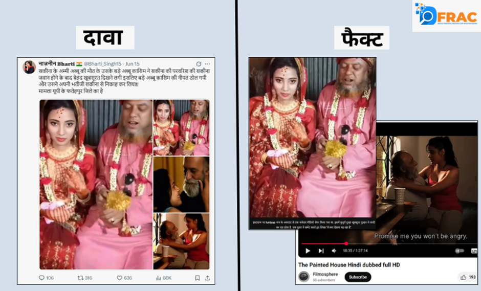 यह दावा गलत है, फतेहपुर में ऐसी कोई शादी नहीं हुई है। वायरल तस्वीर एक बुजुर्ग की कम उम्र की लड़की से शादी का है। वहीं कोलाज की अन्य तस्वीरें फिल्म- द पेंटेड हाउस का सीन है।