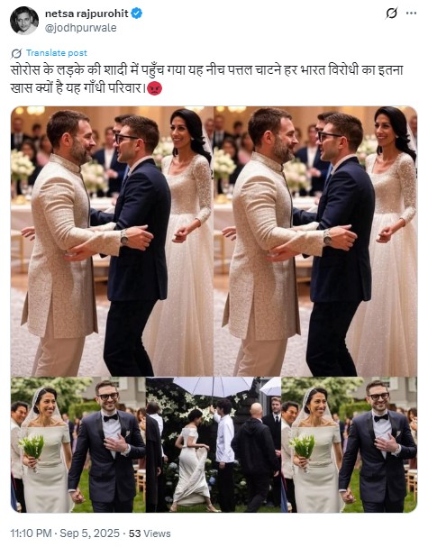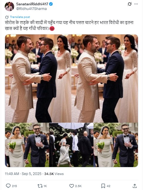 सोशल साईट X पर वायरल तस्वीर को शेयर करते हुए वेरिफाईड यूजर सनातनी ऋद्धि 417 ने लिखा कि सोरोस के लड़के की शादी में पहुँच गया यह नीच पत्तल चाटने हर भारत विरोधी का इतना खास क्यों है यह गाँधी परिवार।😡