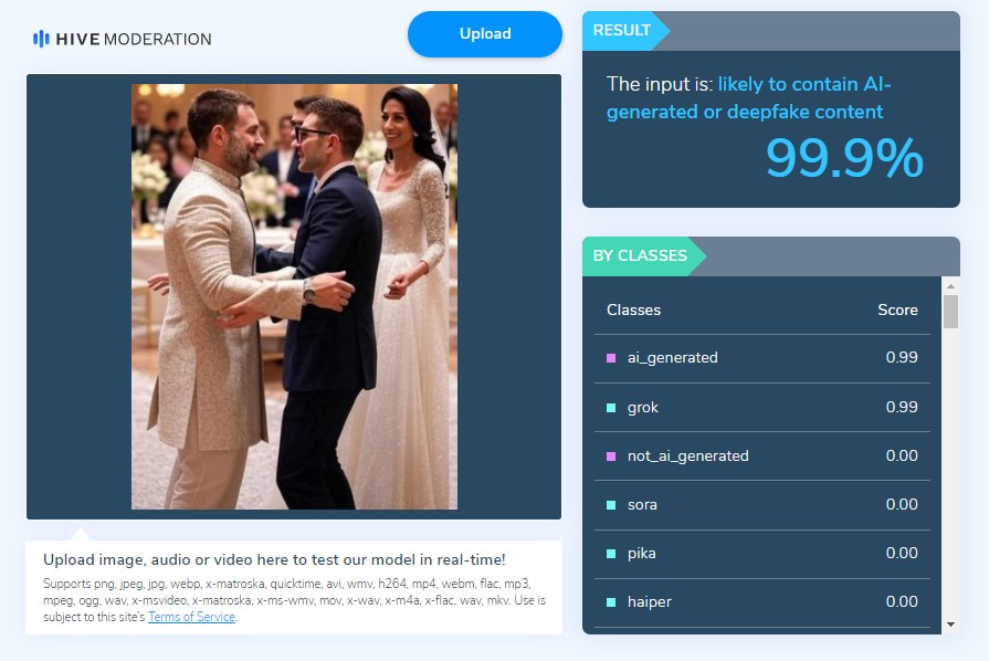 ऐसे में जांच को आगे बढ़ाते हुए हमने एआई-डिटेक्टर टूल हाइव मॉडरेशन (hive moderation) पर वायरल तस्वीर की जांच की। हमारी जांच में परिणाम सामने आया कि वायरल वीडियो के एआई-जनरेटेडहोने के चास 99.9 प्रतिशत हैं।