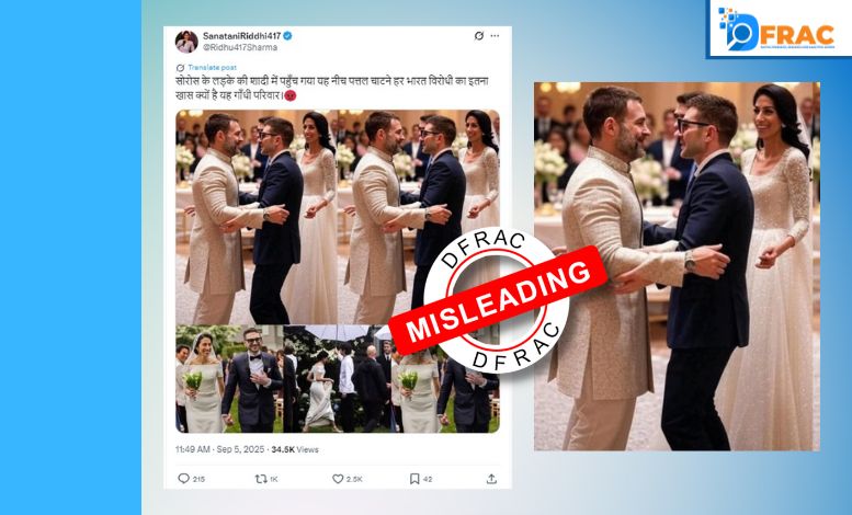 सोशल मीडिया पर लोकसभा में विपक्ष के नेता राहुल गांधी की कुछ तस्वीरें वायरल हो रही है। जिसमे राहुल को शेरवानी पहने हुए दूल्हा-दुल्हन के साथ देखा जा सकता है। तस्वीर के हवाले से दावा किया जा रहा है कि राहुल गांधी जॉर्ज सोरोस के बेटे की शादी में शामिल हुए।