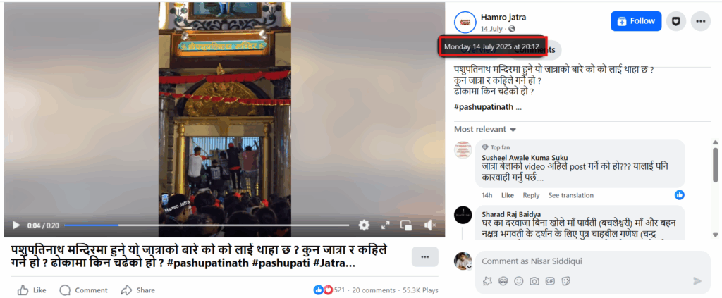 DFRAC की टीम ने वायरल वीडियो की जांच में पाया कि यह वीडियो हालिया प्रदर्शन का नहीं है। इस वीडियो को फेसबुक यूजर Hamro jatra द्वारा 14 जुलाई 2025 को पोस्ट किया गया है, जिसमें शोभायात्रा का जिक्र किया गया है। इस वीडियो के साथ यूजर ने लिखा है, ‘पशुपतिनाथ मंदिर में इस शोभायात्रा के बारे में कौन जानता है? यह कौन सी शोभायात्रा है और कब निकलती है? यह द्वार पर क्यों चढ़ रही है?’