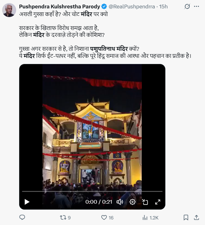 Pushpendra Kulshrestha Parody नामक यूजर ने वीडियो शेयर कर लिखा, ‘असली गुस्सा कहाँ है? और चोट मंदिर पर क्यो सरकार के खिलाफ विरोध समझ आता है, लेकिन मंदिर के दरवाज़े तोड़ने की कोशिश? गुस्सा अगर सरकार से है, तो निशाना पशुपतिनाथ मंदिर क्यों? ये मंदिर सिर्फ ईंट-पत्थर नहीं, बल्कि पूरे हिंदू समाज की आस्था और पहचान का प्रतीक है।’