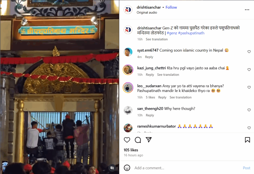 इंस्टाग्राम पर drishtisanchar नामक यूजर ने वीडियो के साथ नेपाली भाषा में कैप्शन लिखा है, जिसका हिन्दी अनुवाद है, ‘Gen-Z के नाम पर घुसपैठियों द्वारा पशुपतिनाथ मंदिर में तोड़फोड़।’