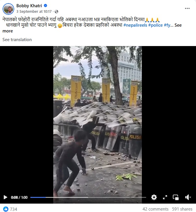 DFRAC के फैक्ट चेक से साफ है कि सोशल मीडिया पर शेयर किया गया वीडियो नेपाल का नहीं है। यह वीडियो पिछले दिनों इंडोनेशिया में हुए प्रदर्शन के दौरान पुलिसकर्मियों पर हमले का है। इसलिए यूजर्स का दावा भ्रामक है।