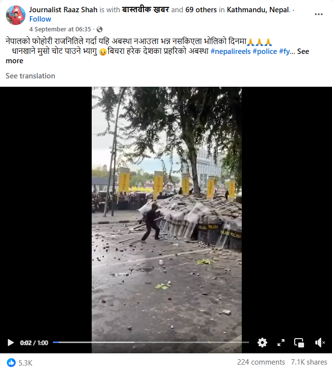 नेपाल के सोशल मीडिया यूजर्स इस वीडियो को नेपाल का बताकर शेयर कर रहे हैं। नेपाली भाषा में Journalist Raaz Shah नामक यूजर ने कैप्शन लिखा, जिसका हिन्दी अनुवाद है, ‘नेपाल की गंदी राजनीति के कारण ये हालात नहीं आएंगे मैं कह नहीं सकता.. धान खाने वाला चूहा और मेंढक जो घायल हो जाते है.. हर देश में पुलिस का बुरा हाल # nepali #’