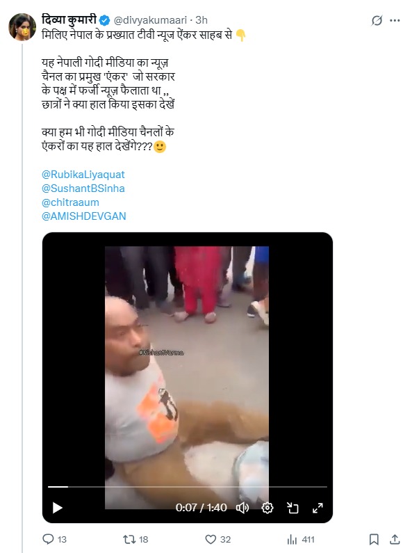 दिव्या कुमारी नामक यूजर ने वीडियो को शेयर करते हुए लिखा, ‘मिलिए नेपाल के प्रख्यात टीवी न्यूज ऐंकर साहब से. यह नेपाली गोदी मीडिया का न्यूज़ चैनल का प्रमुख ‘एंकर’ जो सरकार के पक्ष में फर्जी न्यूज़ फैलाता था ,, छात्रों ने क्या हाल किया इसका देखें क्या हम भी गोदी मीडिया चैनलों के एंकरों का यह हाल देखेंगे???’