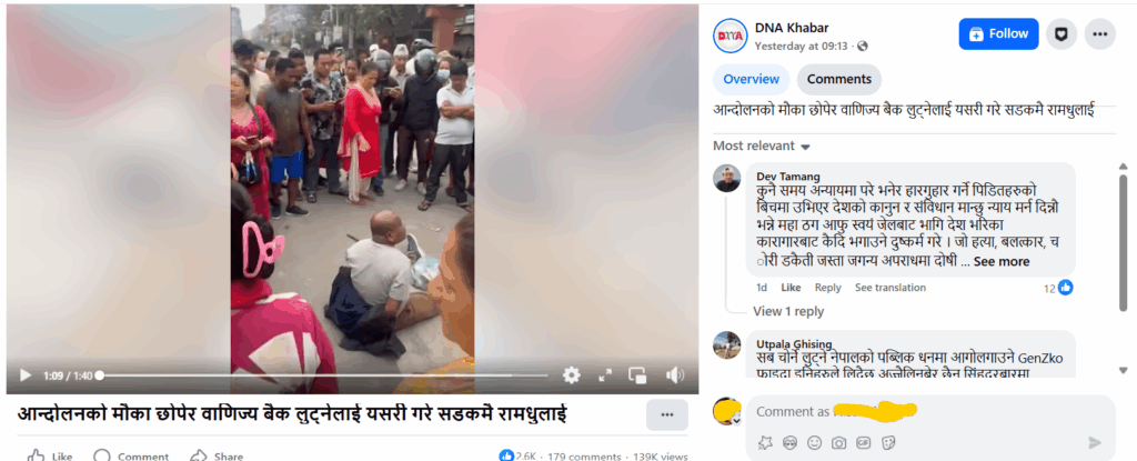 DFRAC की टीम ने वायरल वीडियो की जांच में पाया कि यह न्यूज एंकर की पिटाई का वीडियो नहीं है। दरअसल यह वीडियो नेपाल में बैंक में लूट की घटना को अंजाम देने वाले आरोपी की पिटाई का है। इस वीडियो के साथ DNA खबर नामक नेपाली डिजिटल मीडिया संस्थान ने न्यूज कवर किया है। वीडियो के साथ नेपाली भाषा में कैप्शन दिया गया है, जिसका हिन्दी अनुवाद है, ‘इस तरह उन्होंने विरोध प्रदर्शन का फायदा उठाकर सड़क पर वाणिज्यिक बैंकों को लूटने वालों की पिटाई की।’