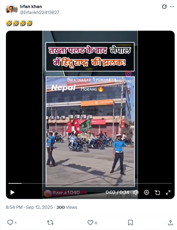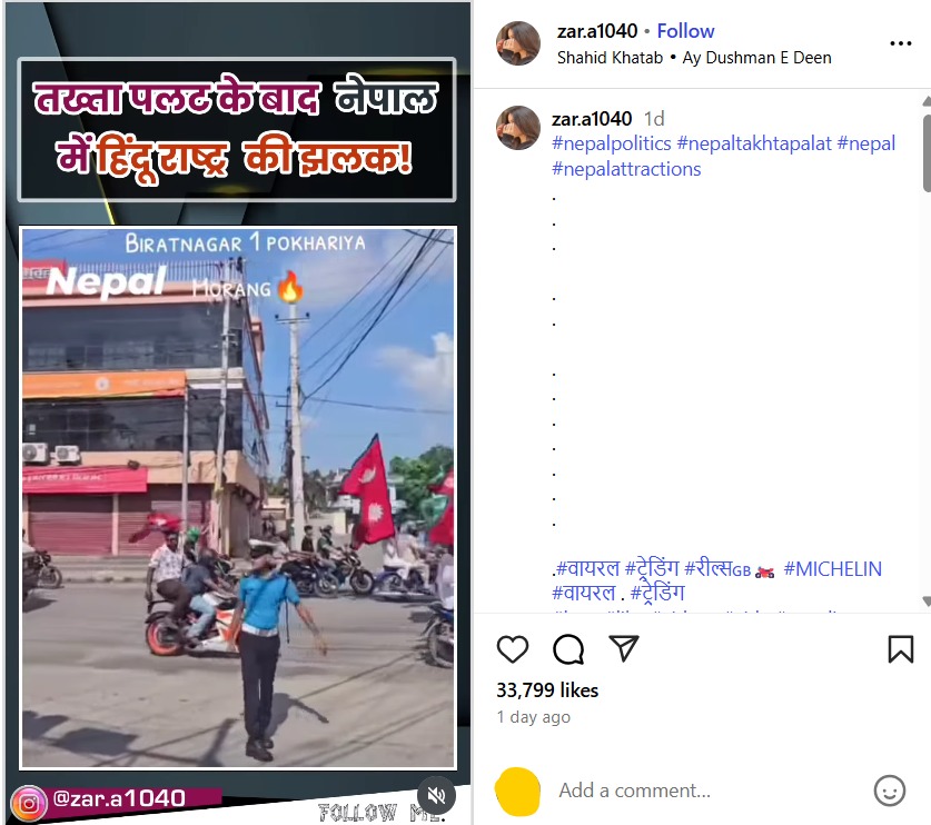 इंस्टाग्राम पर ज़ारा खान नामक यूजर ने वीडियो शेयर किया है, जिस पर टैक्स्ट लिखा है, ‘तख्तापलट के बाद नेपाल में हिन्दू राष्ट्र की झलक’। इस पोस्ट को इंस्टाग्राम पर 33000 से ज्यादा लाइक्स 4 लाख से ज्यादा बार देखा गया है।